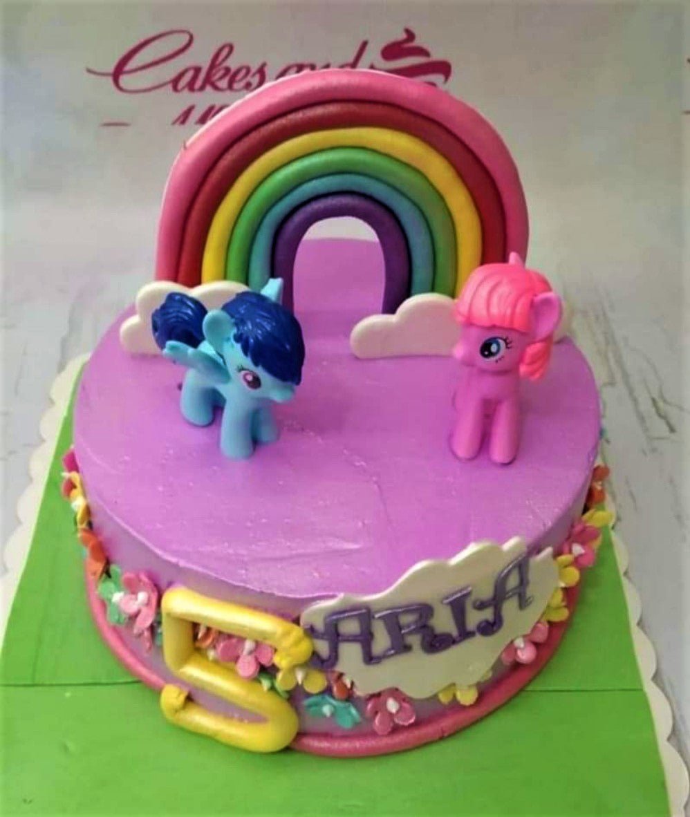 Purple My Little Pony birthday cake with a large fondant rainbow, clouds, and pony figurines.