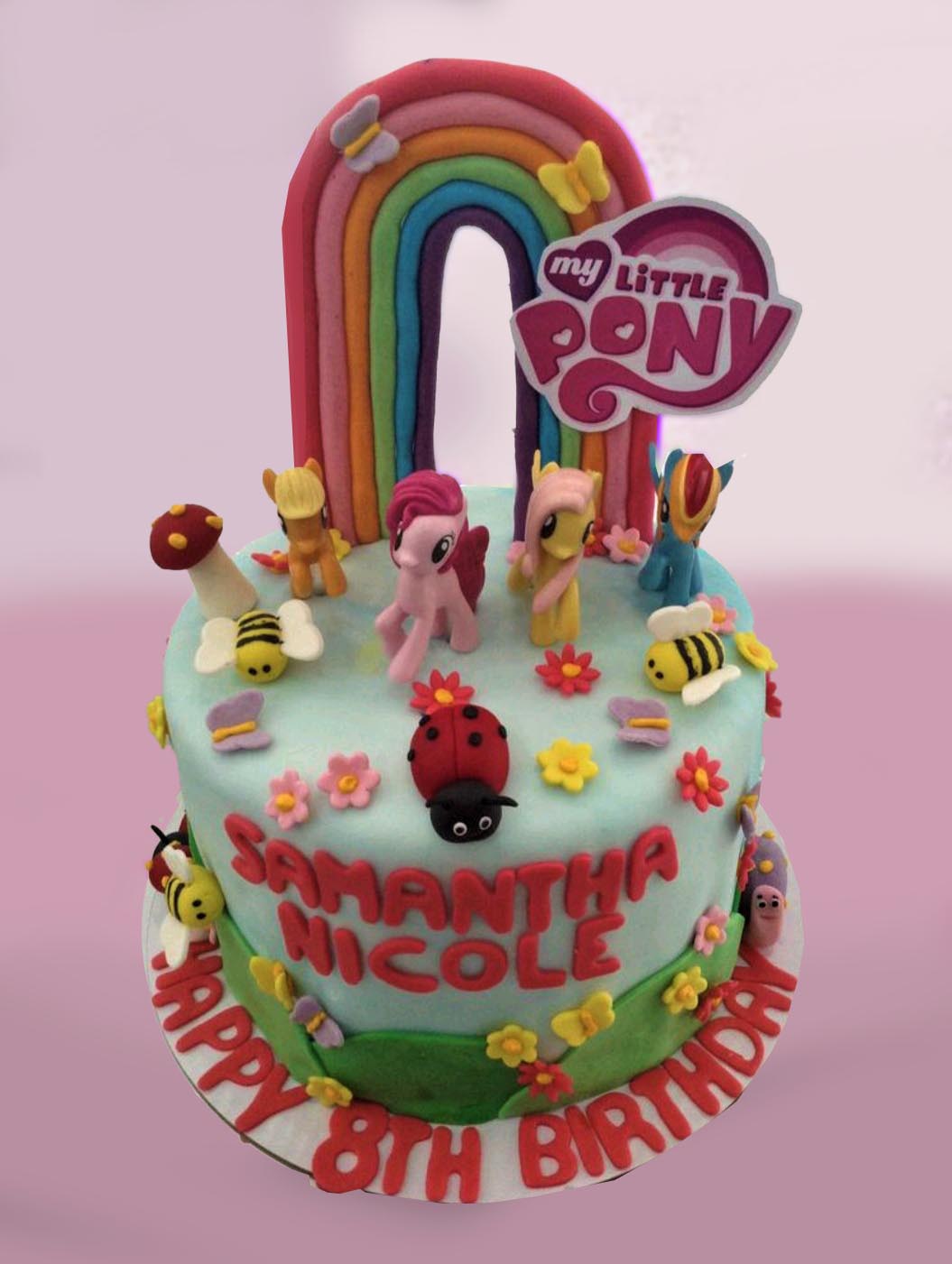 Light blue fondant cake with My Little Pony characters, a large rainbow topper, and garden-themed decorations like bees and ladybugs.