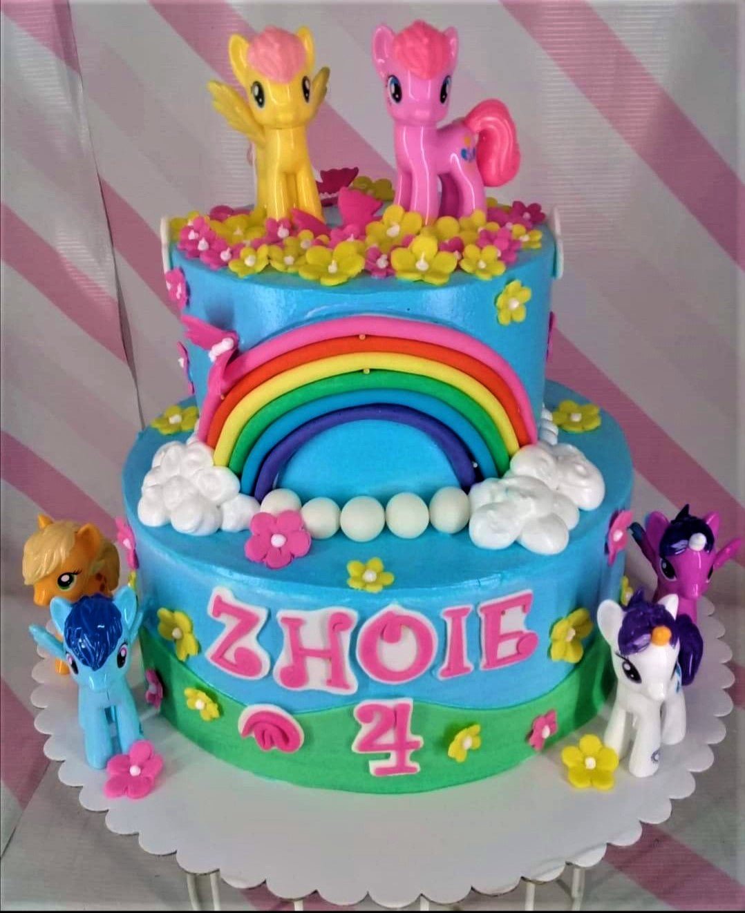 Two-tier light blue My Little Pony themed cake with a large fondant rainbow, white clouds, and various pony figurines.