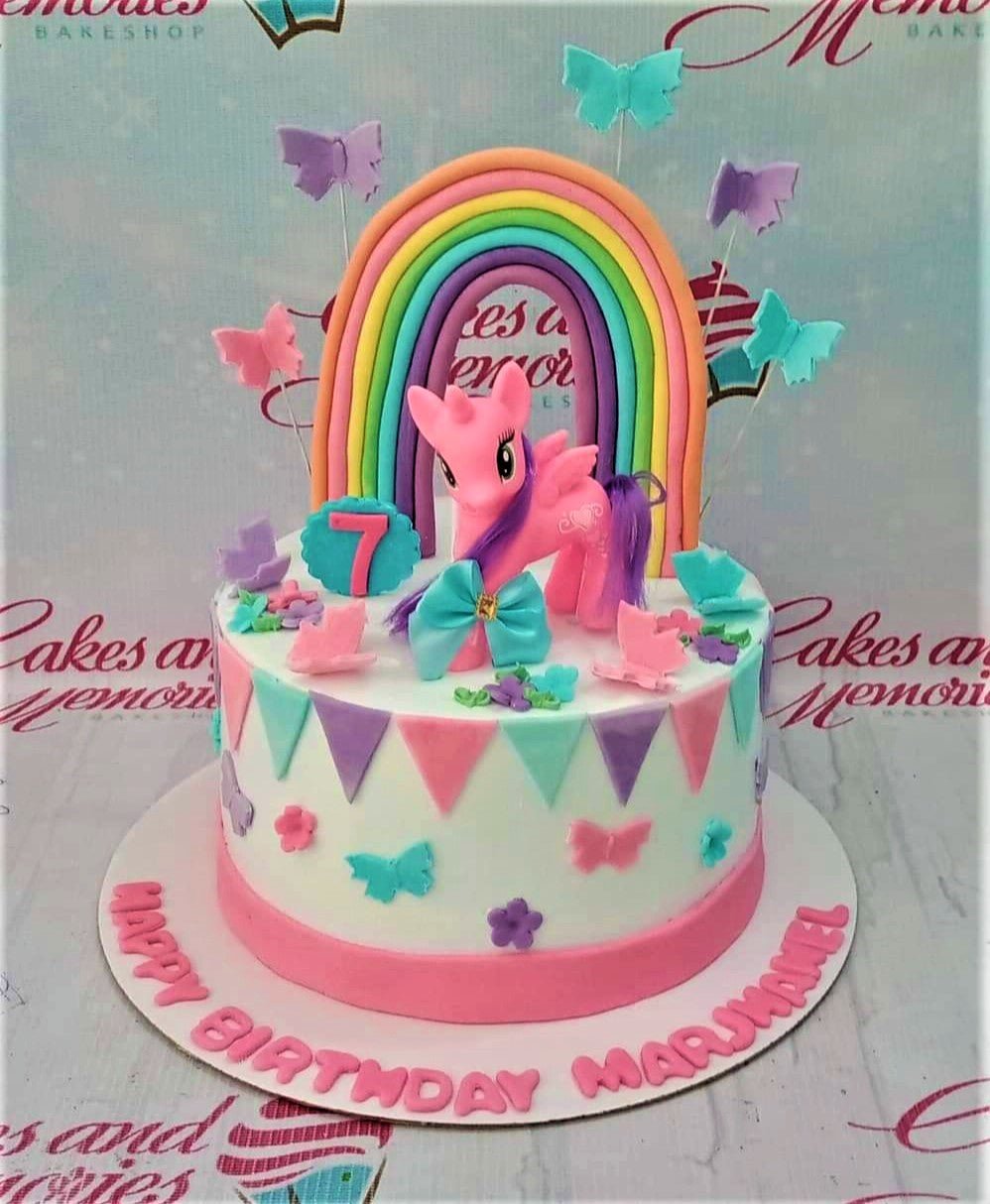 Pink My Little Pony themed birthday cake with a fondant rainbow, pink pony figure, and colorful butterfly and flower decorations.