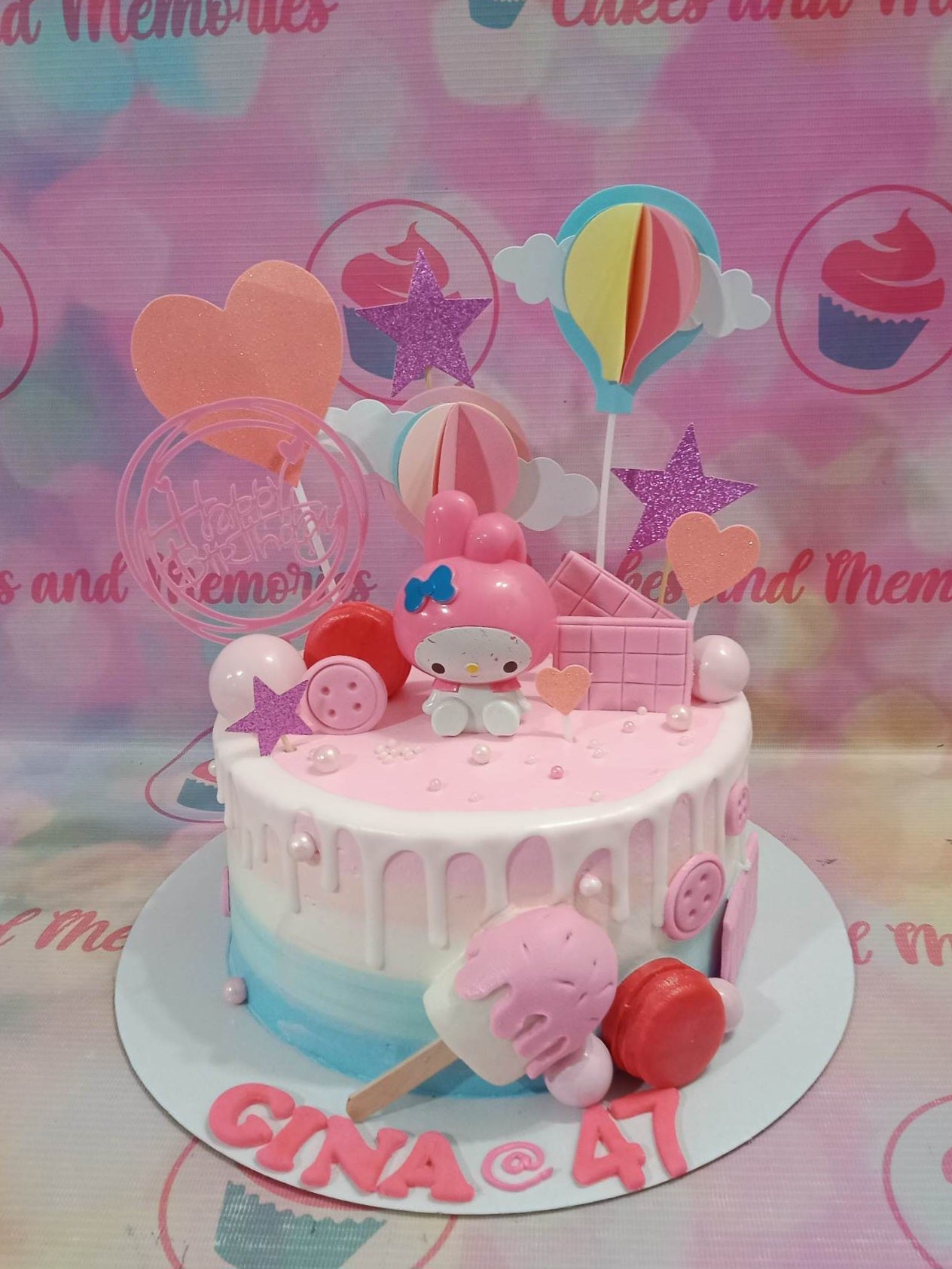 Pink and blue My Melody themed birthday cake with white chocolate drip, fondant buttons, and character toppers.