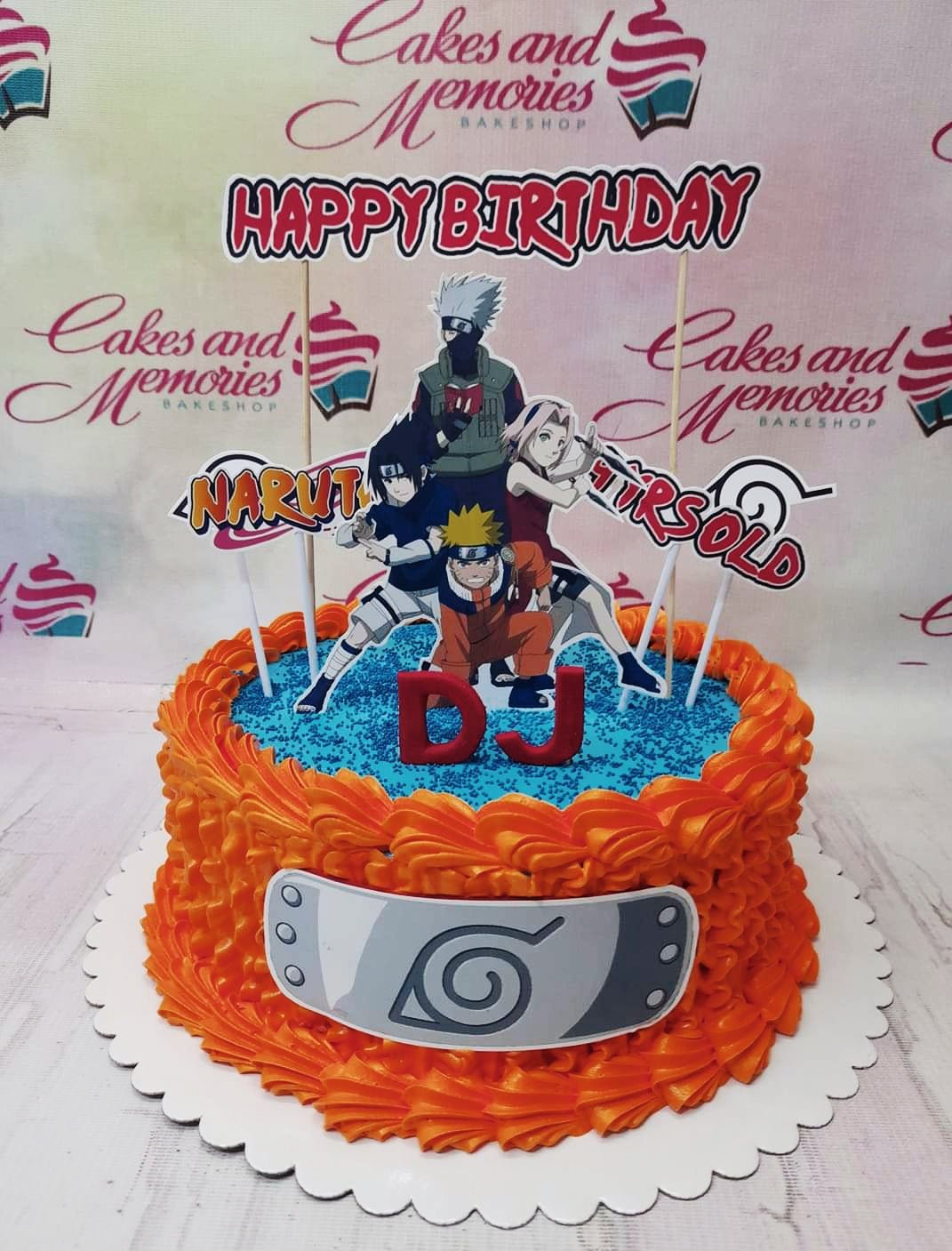 Naruto themed birthday cake with orange icing ruffles, blue sprinkles, and character printouts of Naruto, Sasuke, Sakura, and Kakashi.