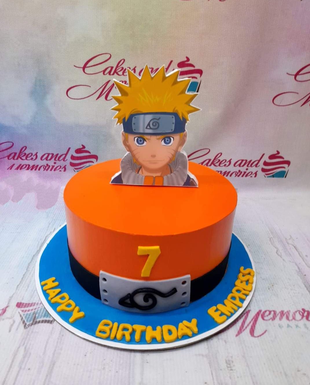 Orange Naruto themed birthday cake with a character printout and a blue base board featuring a yellow birthday message.