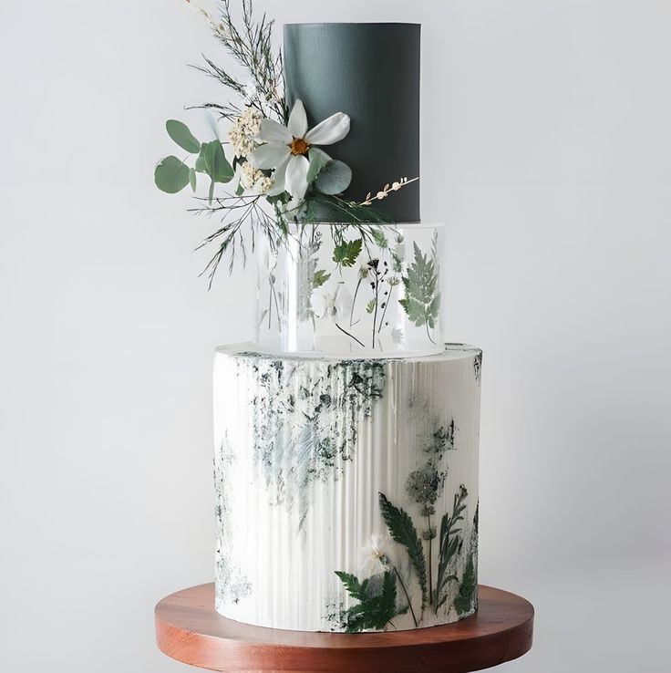 Elegant three-tier nature-inspired cake with a dark teal top tier, clear middle tier with pressed leaves, and a textured white bottom tier.