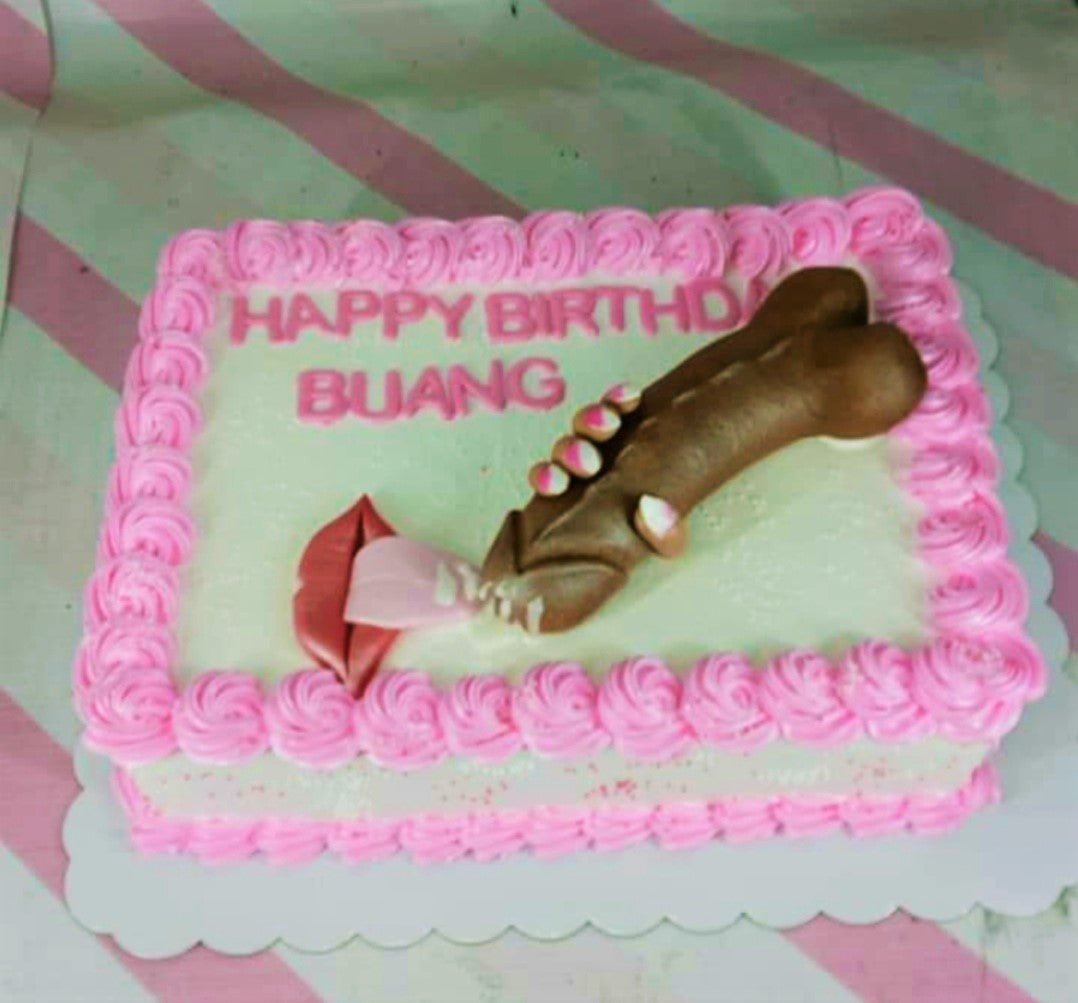 Rectangle white cake with pink icing rosettes featuring a brown 3D fondant figure of a penis and a mouth with a tongue.