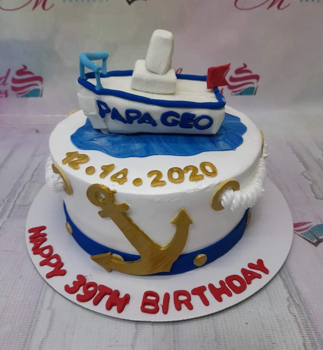 Nautical themed white fondant cake with a 3D fondant boat topper, gold anchor, and blue wave accents for a 39th birthday.