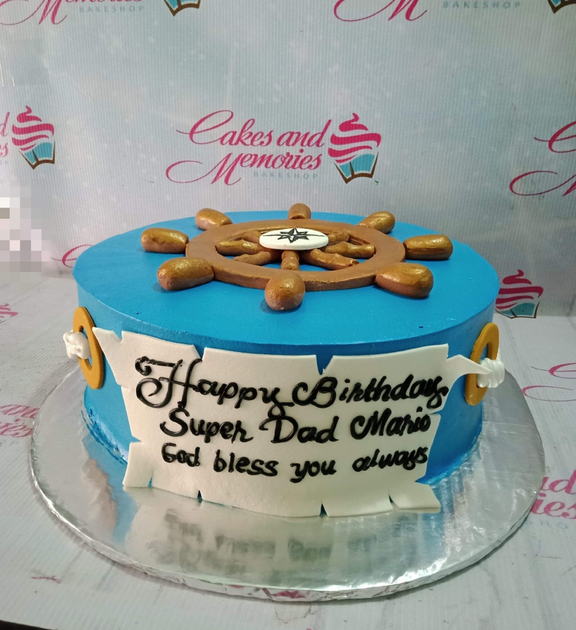 Blue nautical themed birthday cake for Dad with a large ship steering wheel topper and a parchment-style message banner.