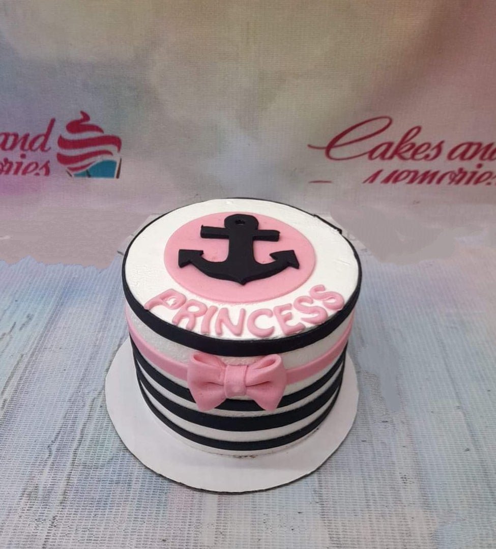 Nautical princess cake with black and white stripes, a pink anchor topper, and a pink fondant bow.