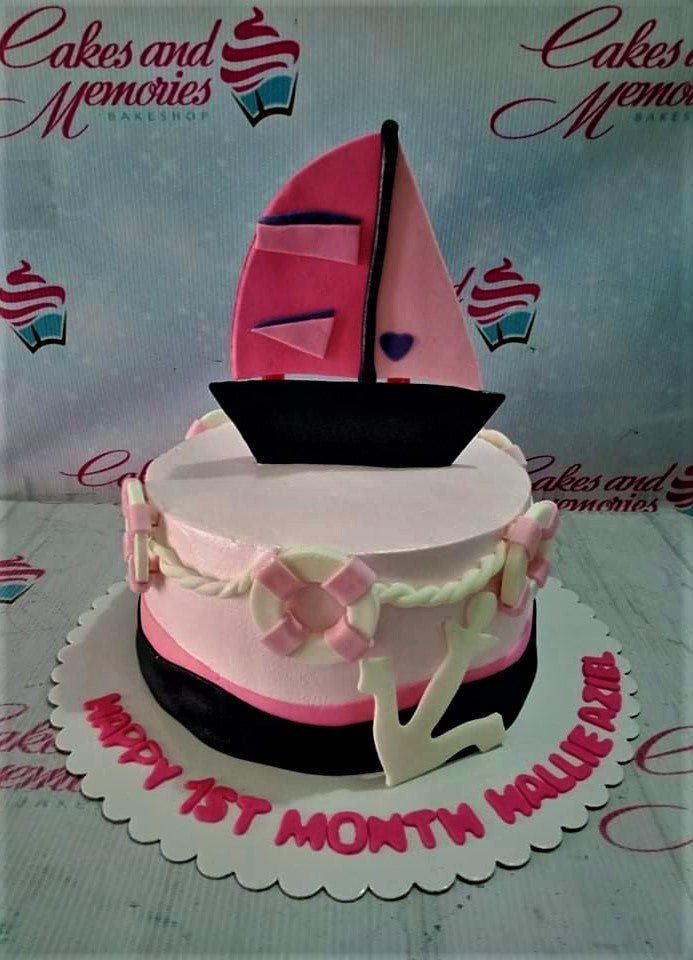 Pink and black nautical themed cake with a large pink sailboat topper, lifebuoys, and an anchor decoration.