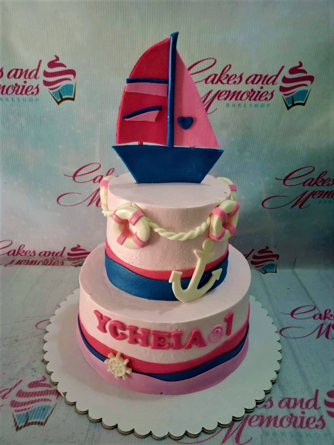 Pink 2-tier nautical themed birthday cake with a large fondant sailboat topper, anchors, and lifebuoys.