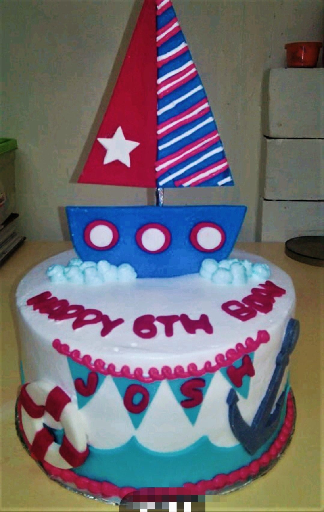 Nautical themed birthday cake with a large sailboat topper, lifebuoy, and anchor decorations in red, white, and blue.