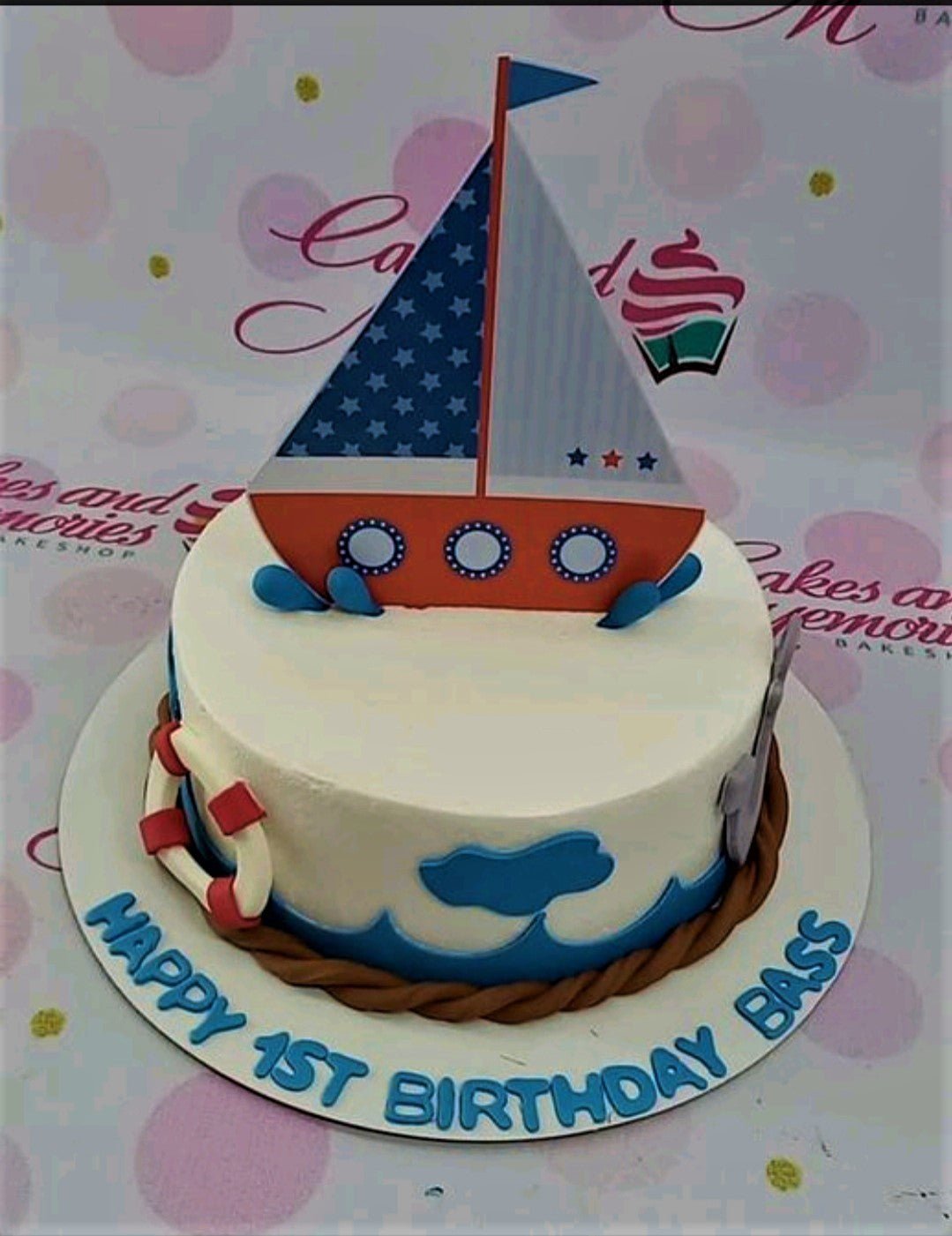 Nautical themed 1-tier birthday cake with a large sailboat printout topper, blue waves, and a lifebuoy decoration.
