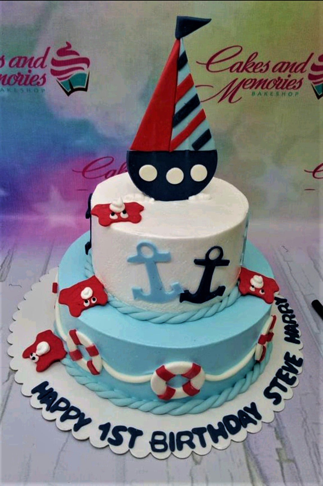 Two-tier nautical themed birthday cake in light blue and white with a large fondant sailboat topper and anchor decorations.