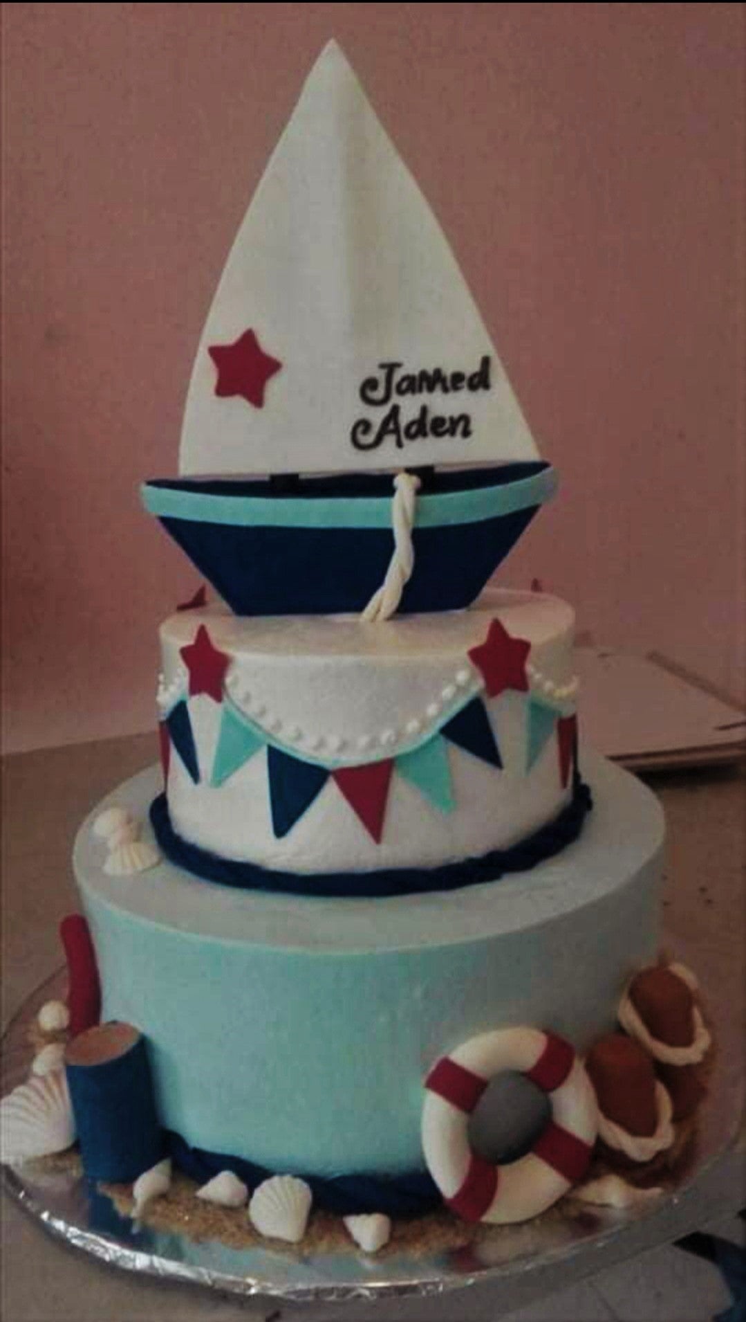 Two-tier nautical sailboat cake in light blue and white with fondant sailboat topper, lifebuoy, and seashell decorations.