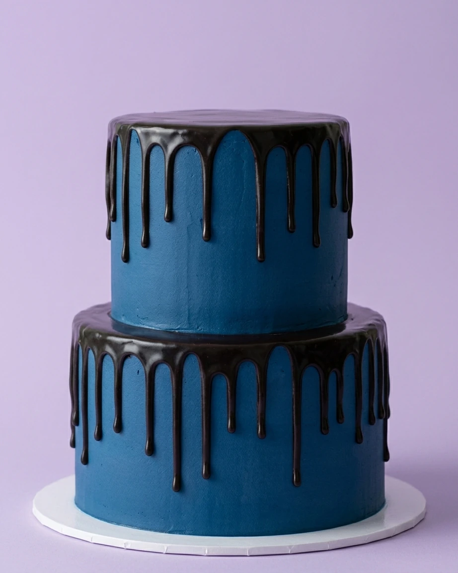 Two-tier navy blue cake with dark chocolate drip on both levels, presented on a white base.