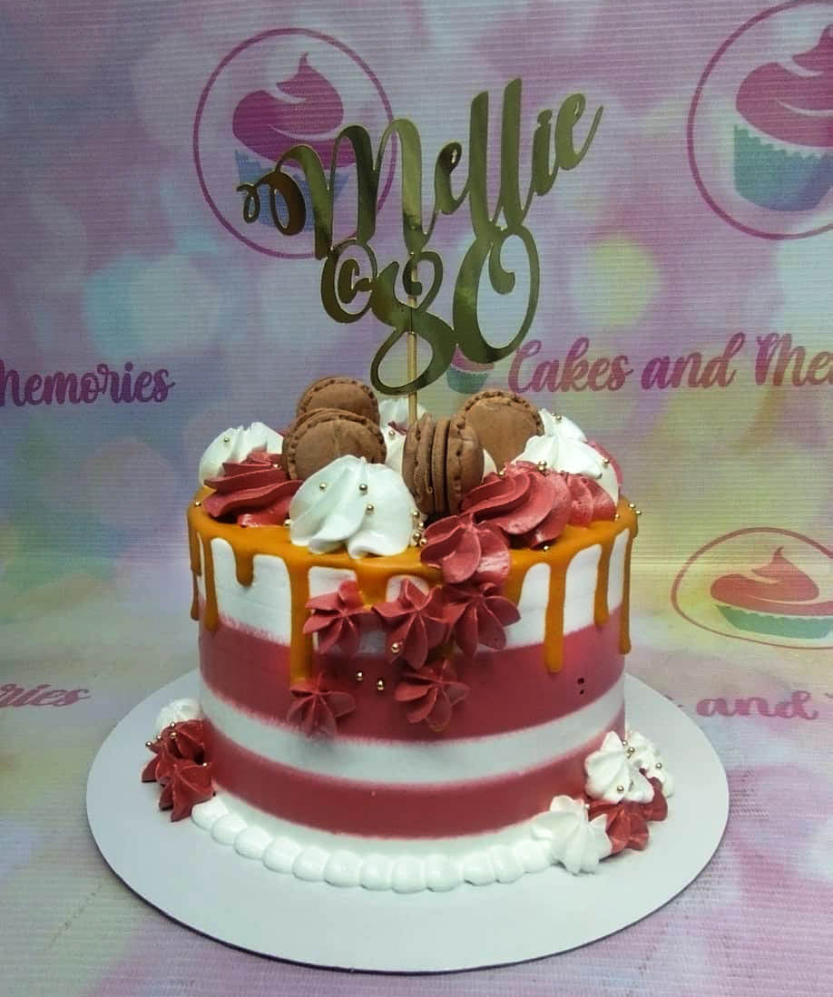 This elegant 1-tier 80th birthday cake features a striking red and white striped icing design. The top is adorned with a vibrant orange drip, chocolate macarons, and intricate red and white icing rosettes. A large gold cardstock topper proudly displays the name Nellie and the number 80. Delicate gold dragees are scattered across the icing swirls for a touch of sophistication. This design is perfect for celebrating a milestone 80th birthday with family and friends. Order your custom celebration cakes through Genie.ph for delivery in Cebu City, Mandaue, and Lapu-lapu City.