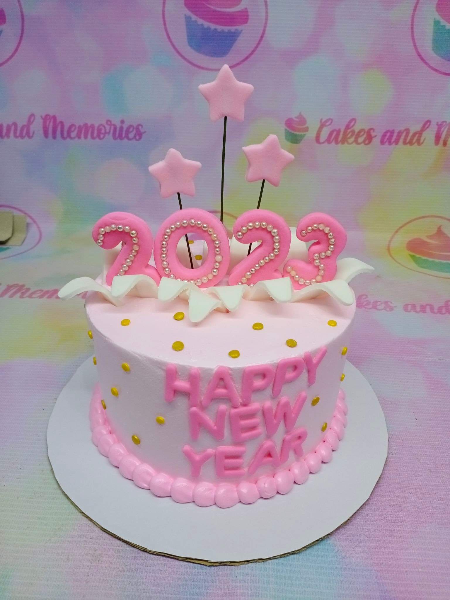 Pink 1-tier Happy New Year cake with 2023 fondant numbers, pink stars, and gold edible dots.