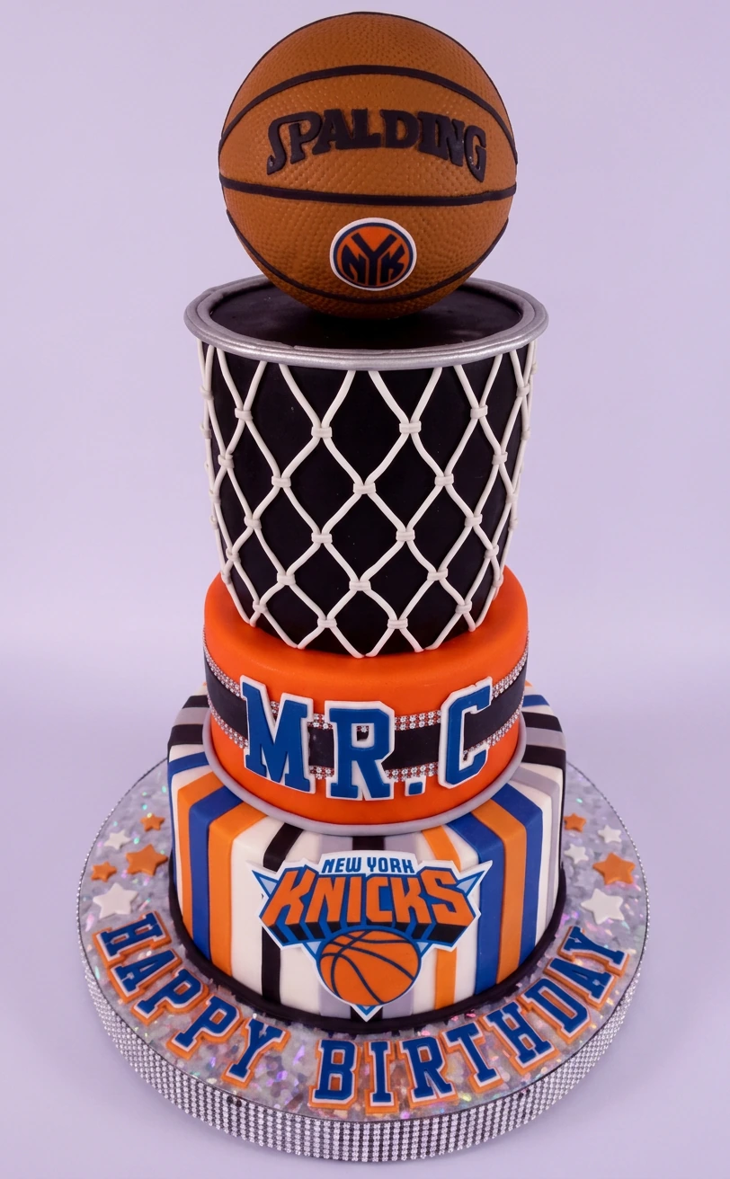 Three-tier New York Knicks basketball themed cake with a Spalding basketball topper and basketball hoop net design.