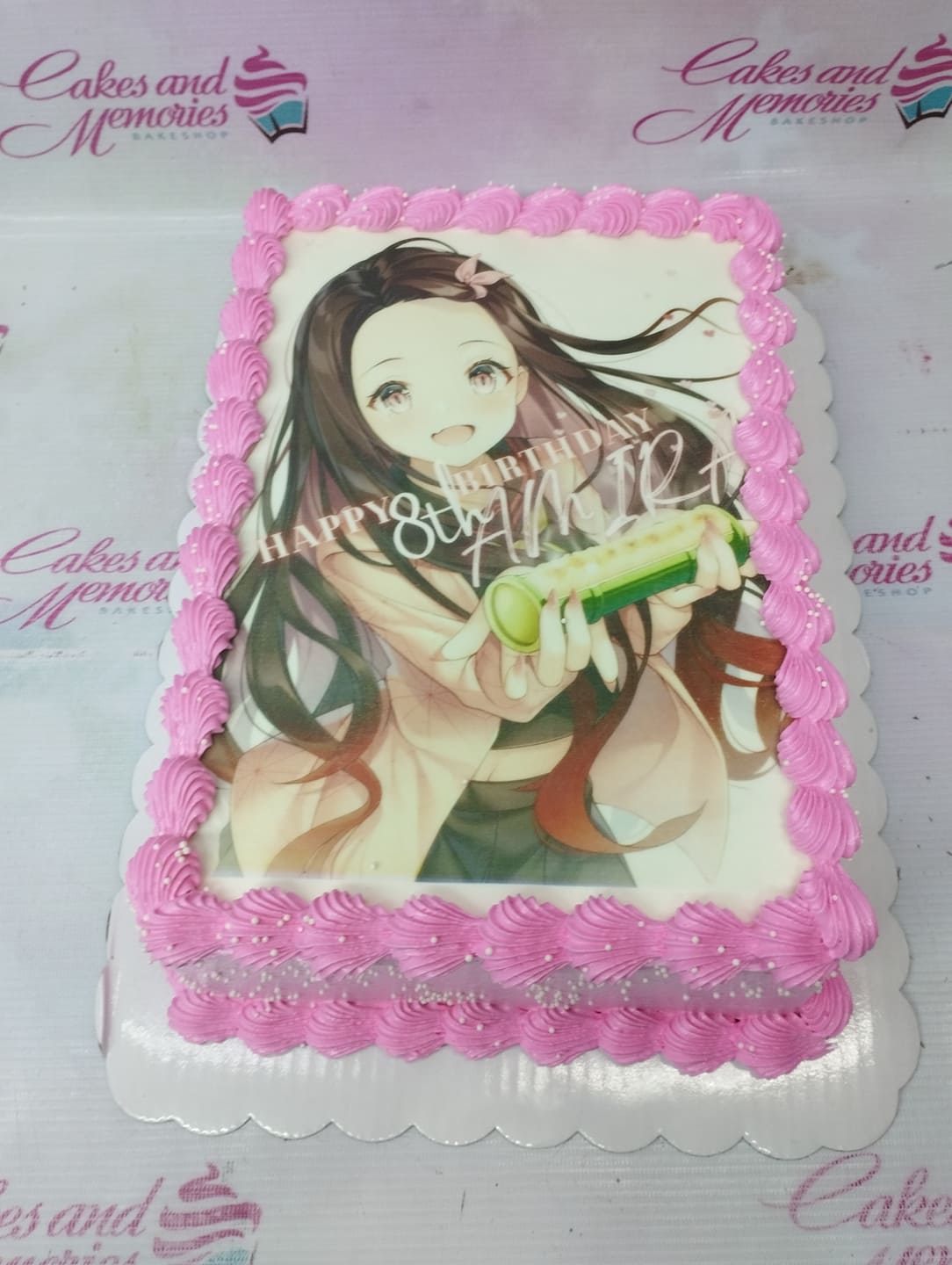 Nezuko Kamado anime character edible print cake with pink icing rosettes and white sprinkles.