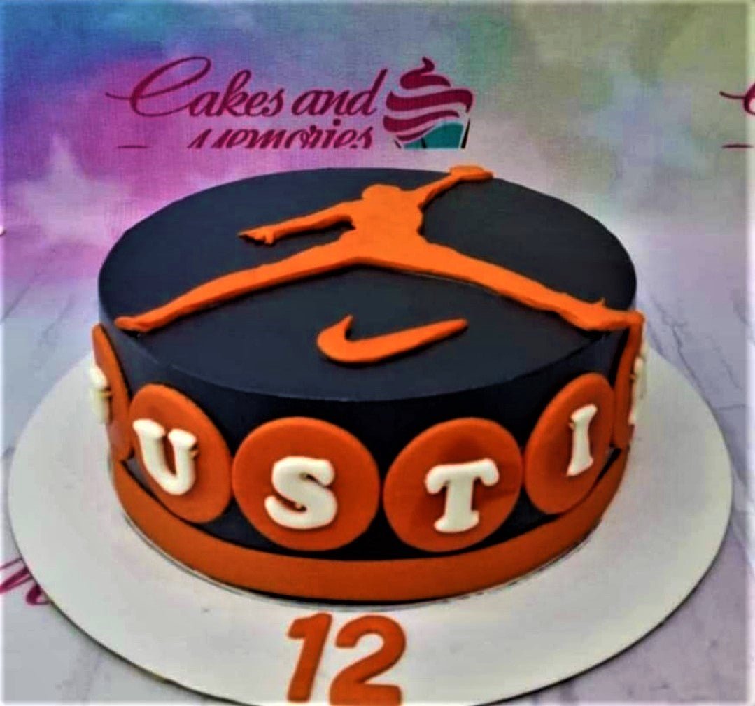 Black and orange Nike Jordan themed birthday cake with Jumpman logo and name Justin