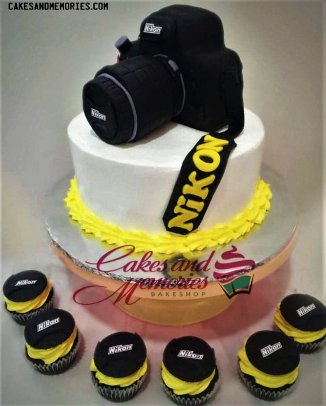 White 1-tier Nikon camera cake with a large black fondant camera topper and yellow icing border, accompanied by matching Nikon cupcakes.