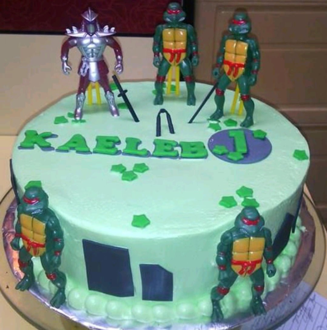 Teenage Mutant Ninja Turtles themed cake with green icing, action figures, and green fondant stars.