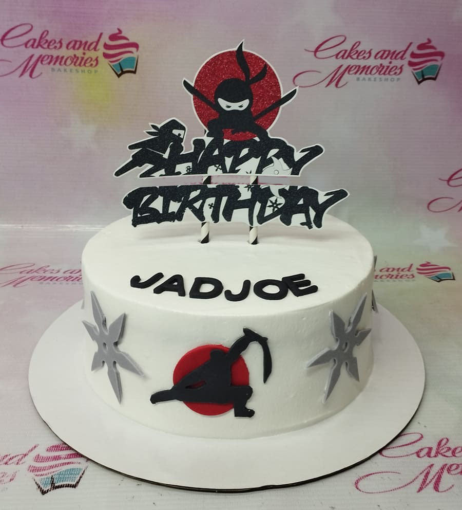 White ninja themed birthday cake with black ninja silhouettes, red sun accents, and grey shuriken decorations.