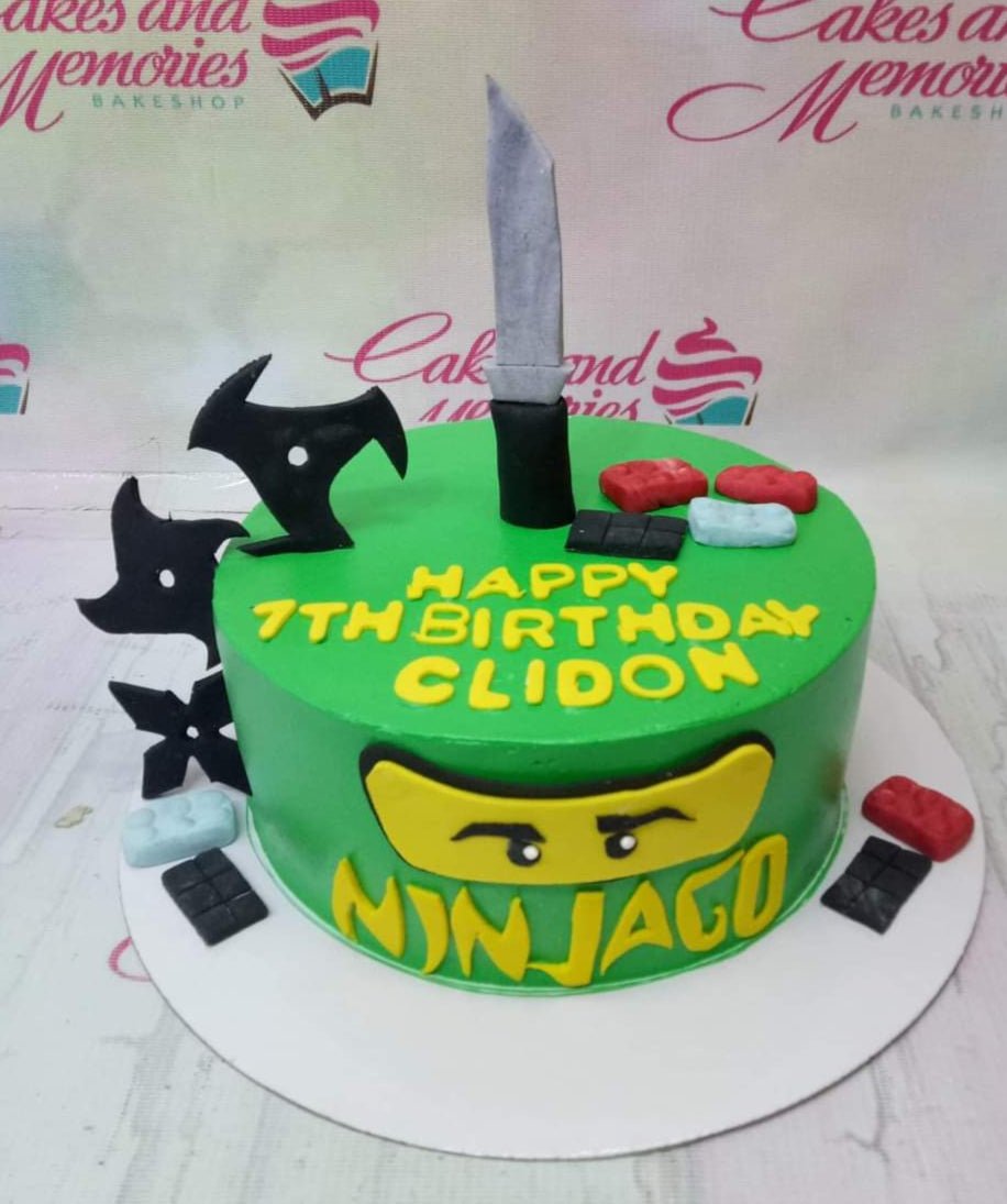 Green Ninjago themed birthday cake with a fondant ninja mask, shuriken stars, and a 3D fondant knife topper.
