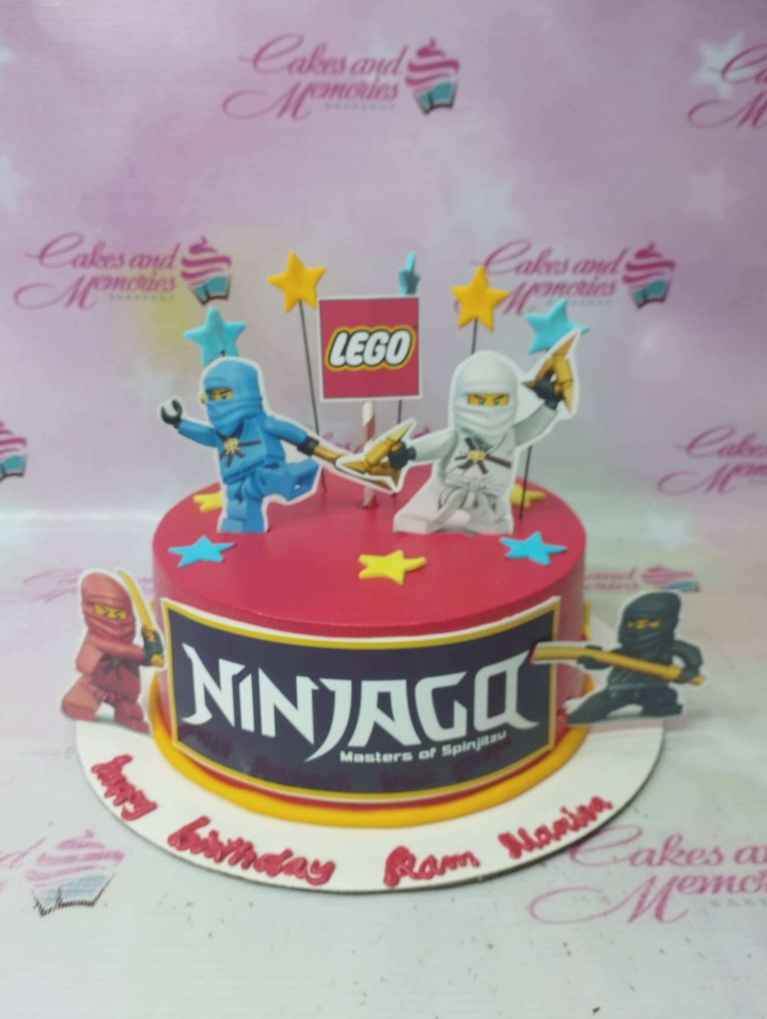 Red Ninjago themed birthday cake with Lego character printouts and yellow and blue stars.