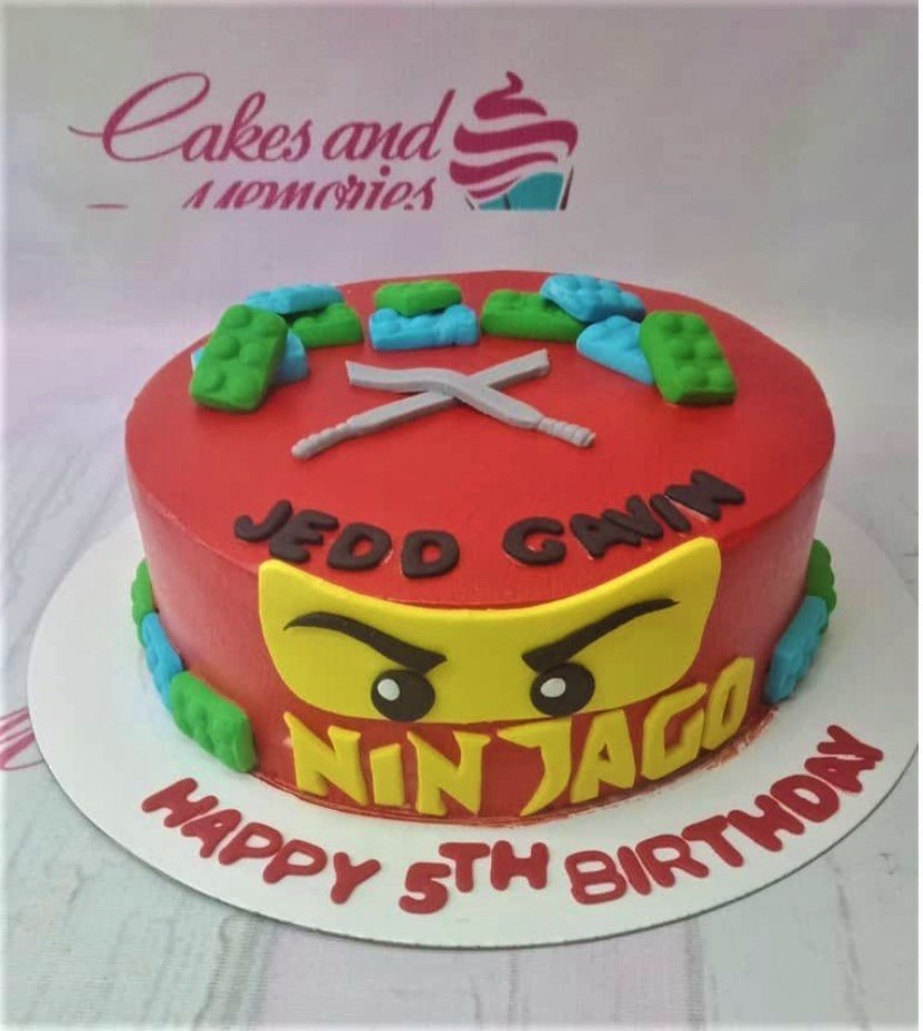 Red Ninjago themed birthday cake with Lego brick decorations and crossed swords on top.