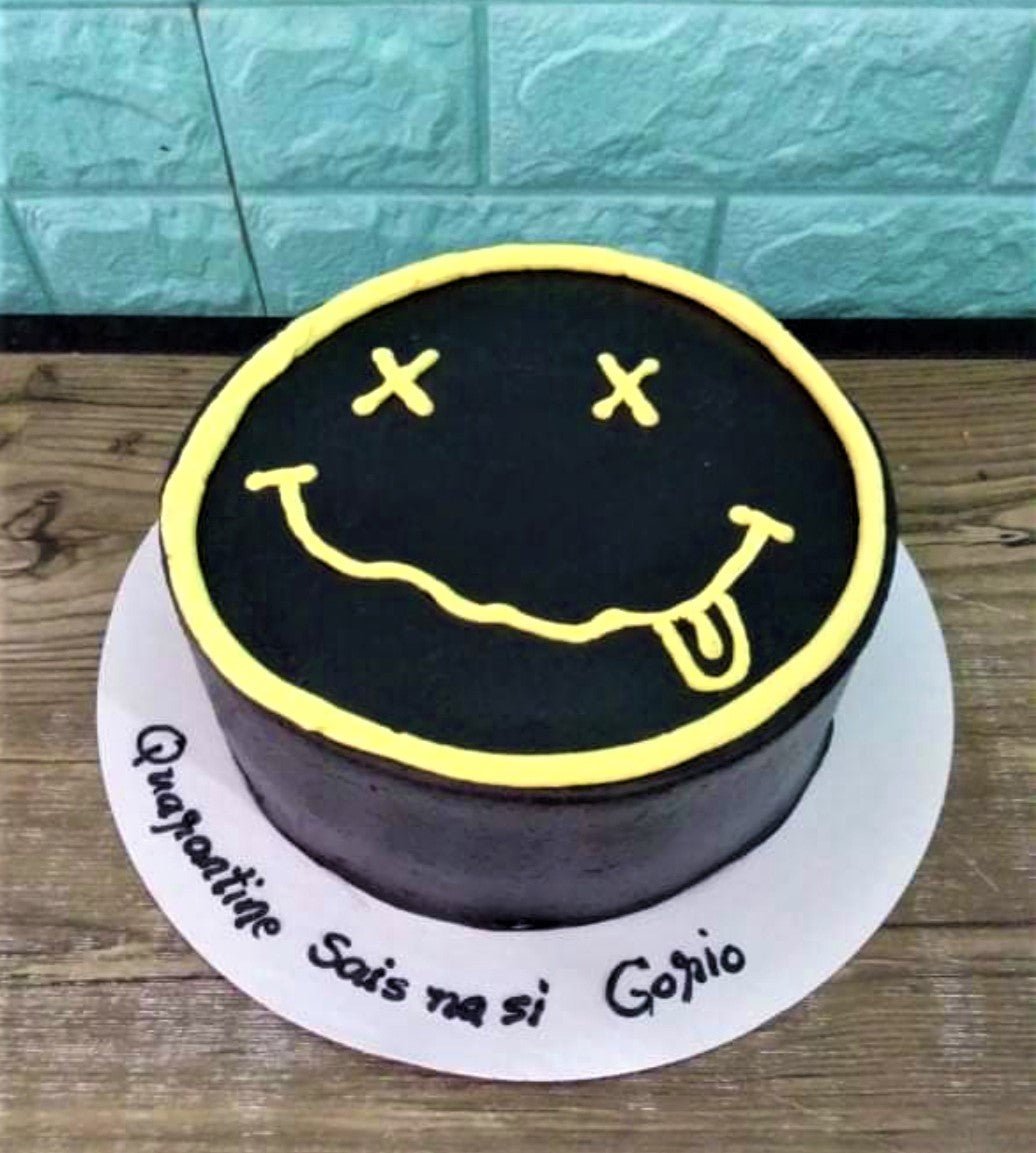 Black minimalist cake with a yellow Nirvana-style smiley face design and a birthday message on the white base board.