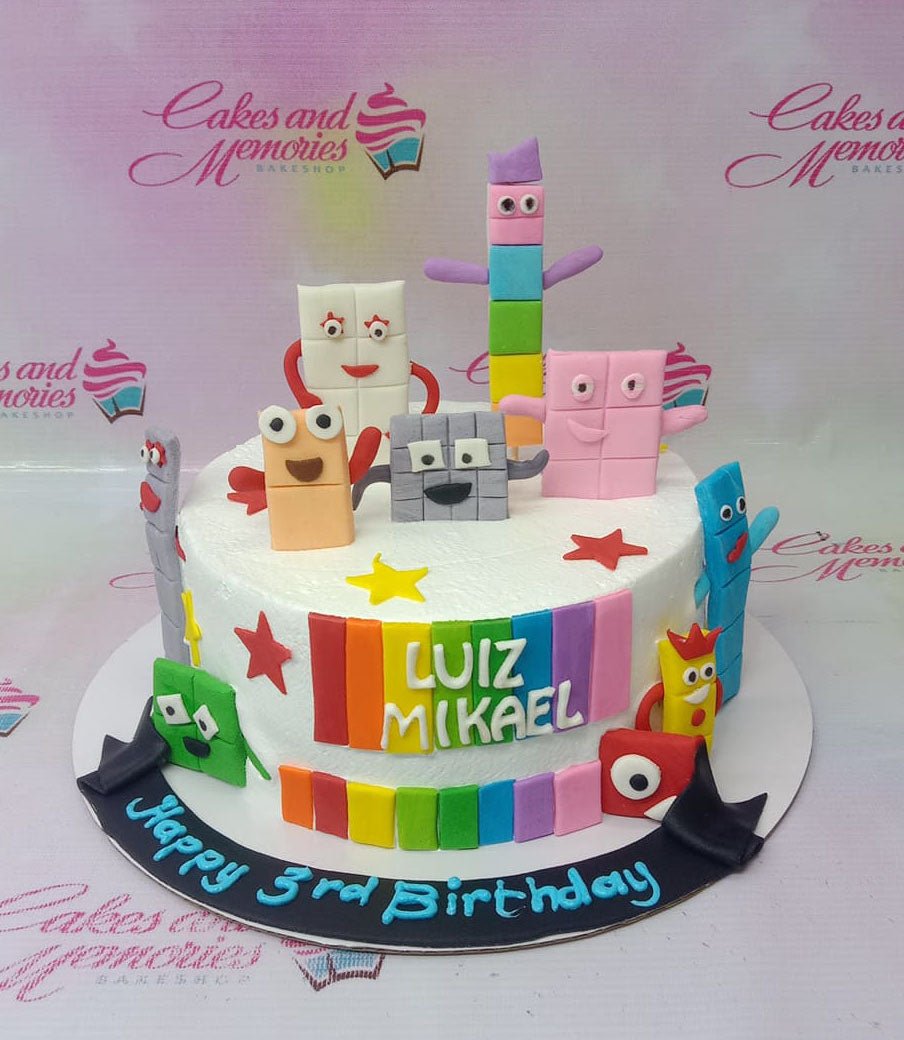 White round Numberblocks birthday cake with colorful fondant characters and a black banner message.