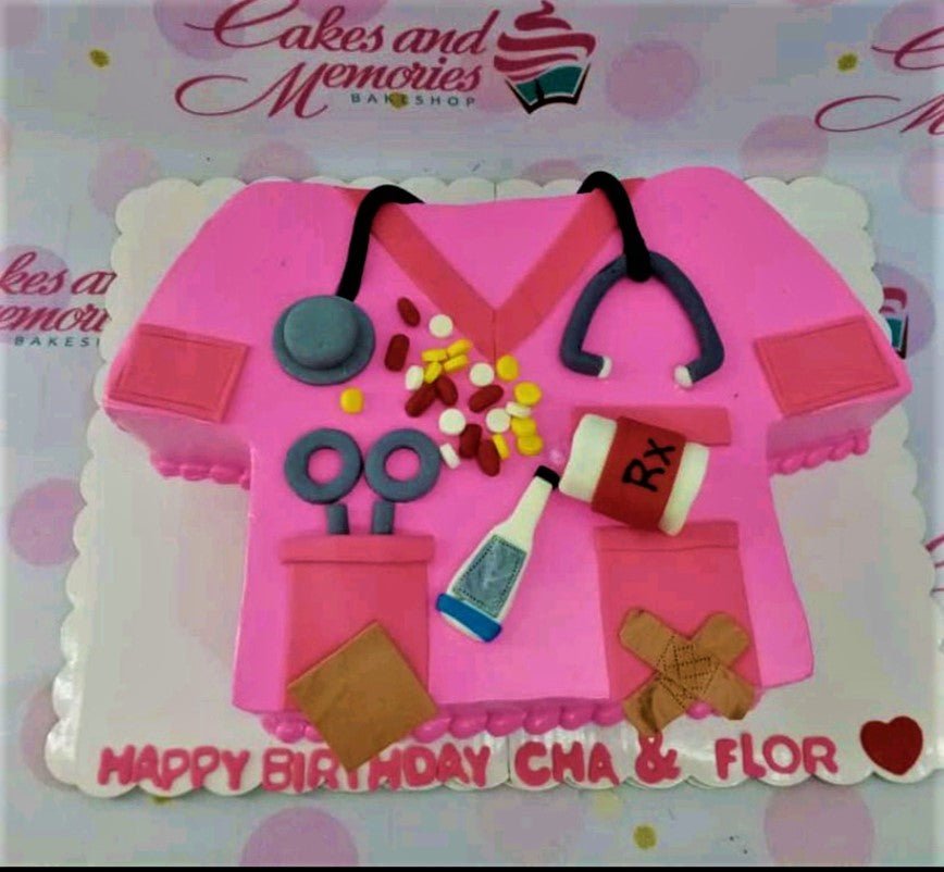 Pink nurse scrub shaped cake with fondant stethoscope, pills, medicine bottle, and thermometer decorations.