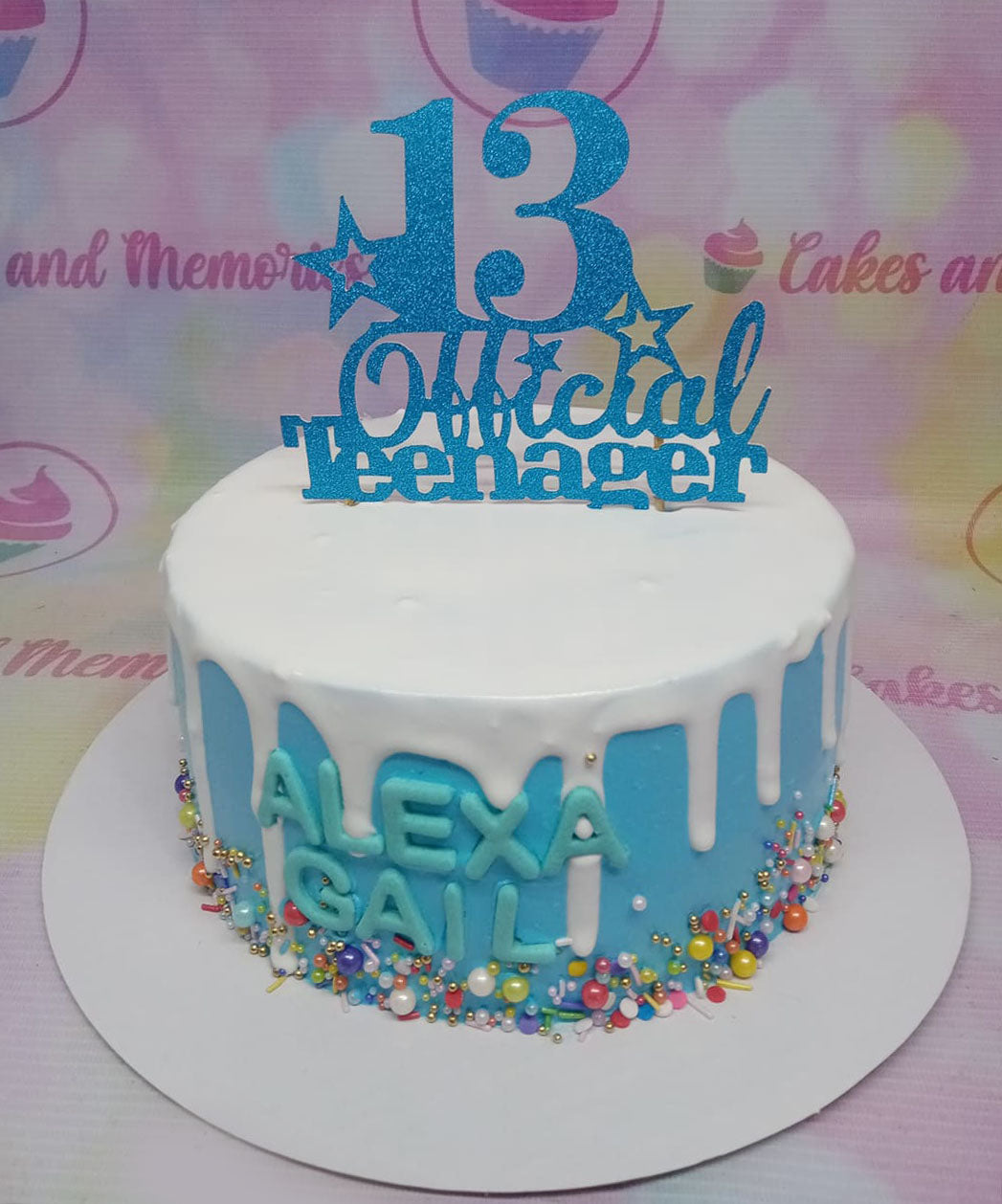 Blue and white drip cake for a 13th birthday with a glittery blue topper and colorful sprinkles.