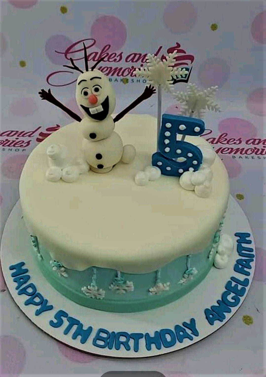 Olaf Frozen themed birthday cake with a blue number 5 topper and white snowflake decorations on a light blue and white fondant base.