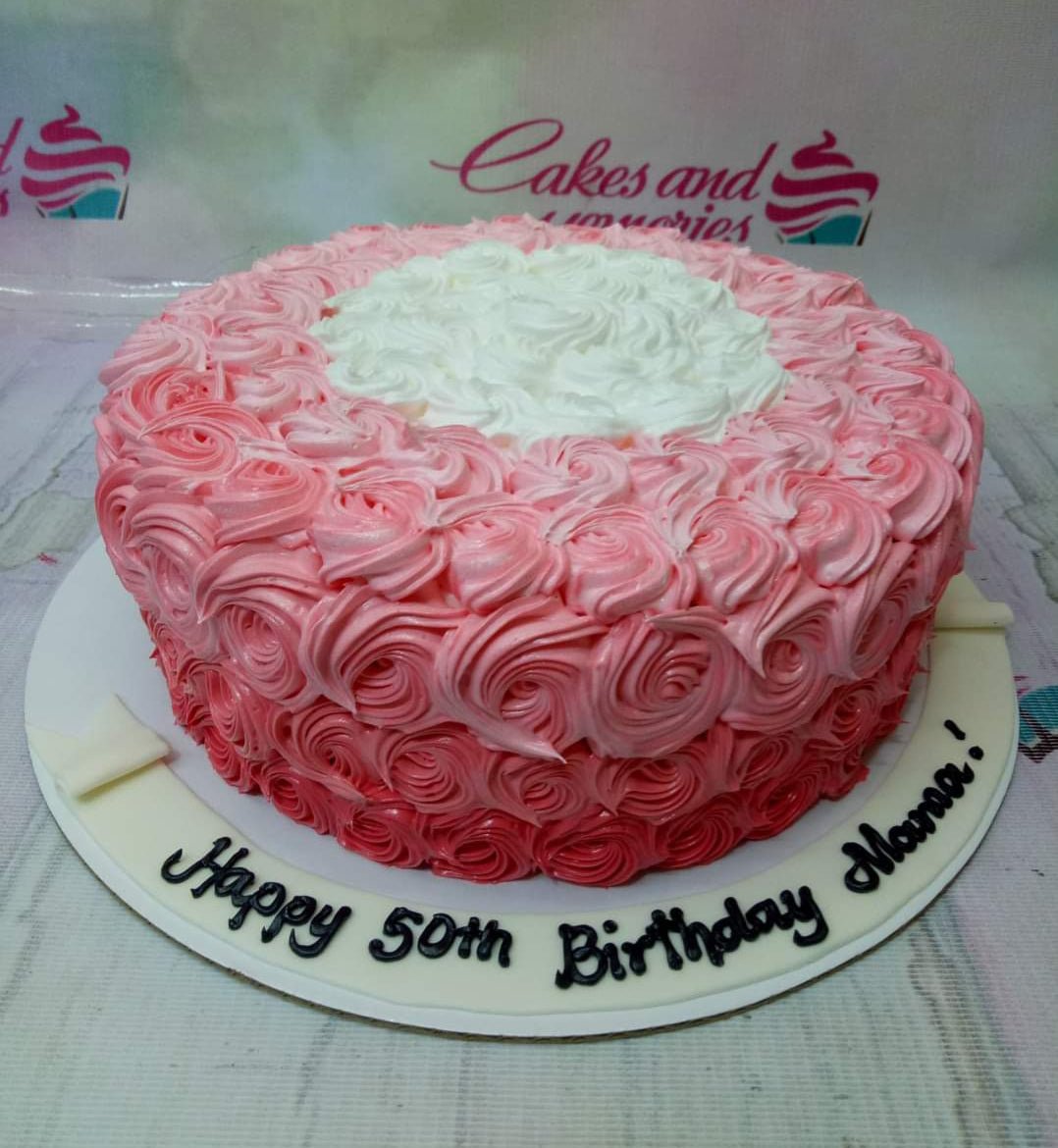 This elegant 1-tier ombre pink rosette cake is the perfect centerpiece for a 50th birthday celebration. The design features intricate piped icing rosettes that transition from a deep pink at the base to a soft white at the top. The entire surface is covered in these delicate floral swirls, creating a textured and sophisticated look. A personalized message 'Happy 50th Birthday Mama!' is piped in black icing on the white base board. This design is ideal for honoring a special mother or grandmother on her milestone day. Order this beautiful custom creation through Genie.ph for delivery in Cebu City, Mandaue, or Lapu-lapu City.
