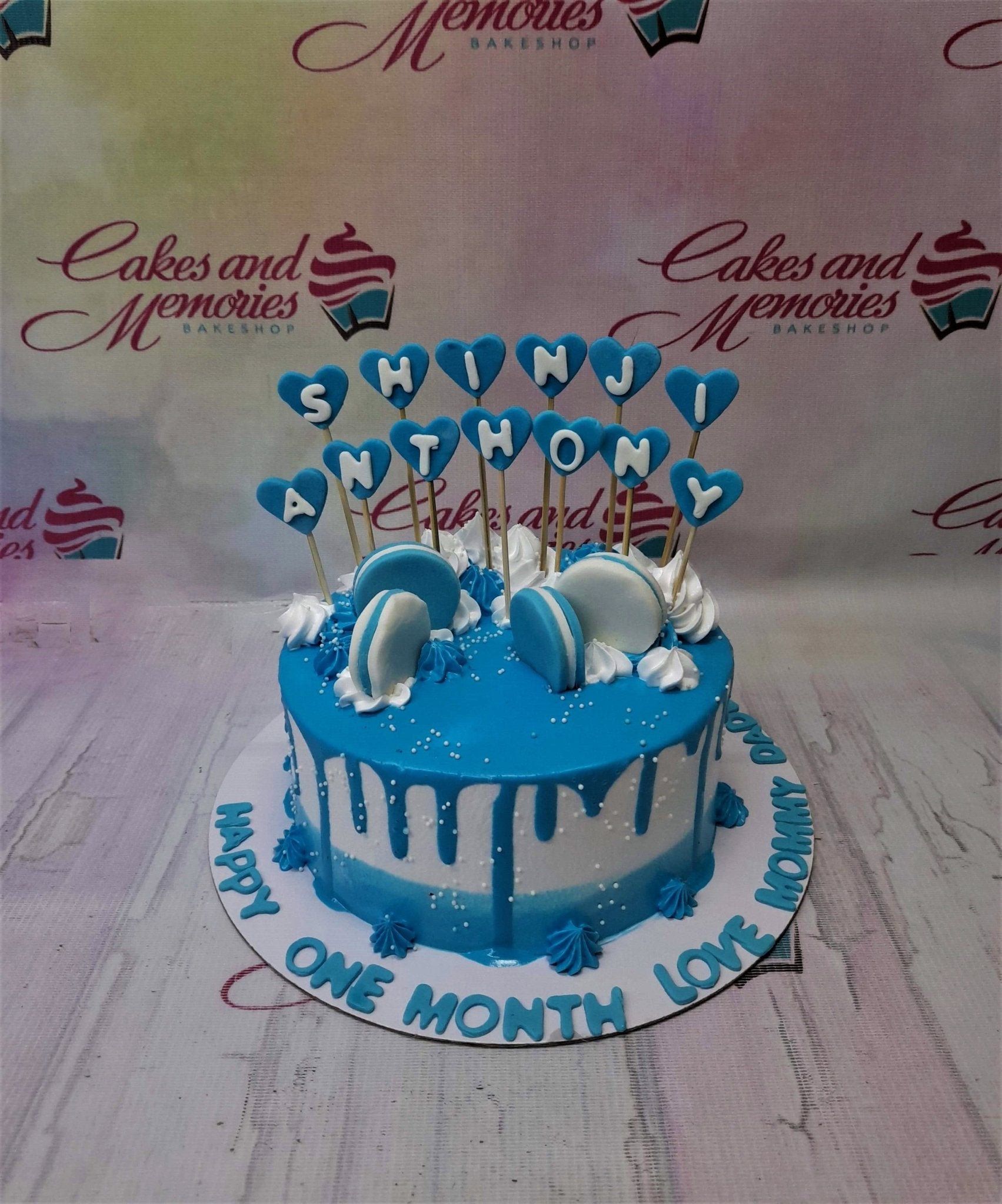 Blue and white ombre drip cake with heart-shaped name toppers and blue macarons for a one-month celebration.