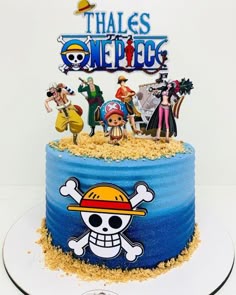 One Piece themed blue gradient cake with Luffy and crew character toppers and a large Jolly Roger logo on the side.