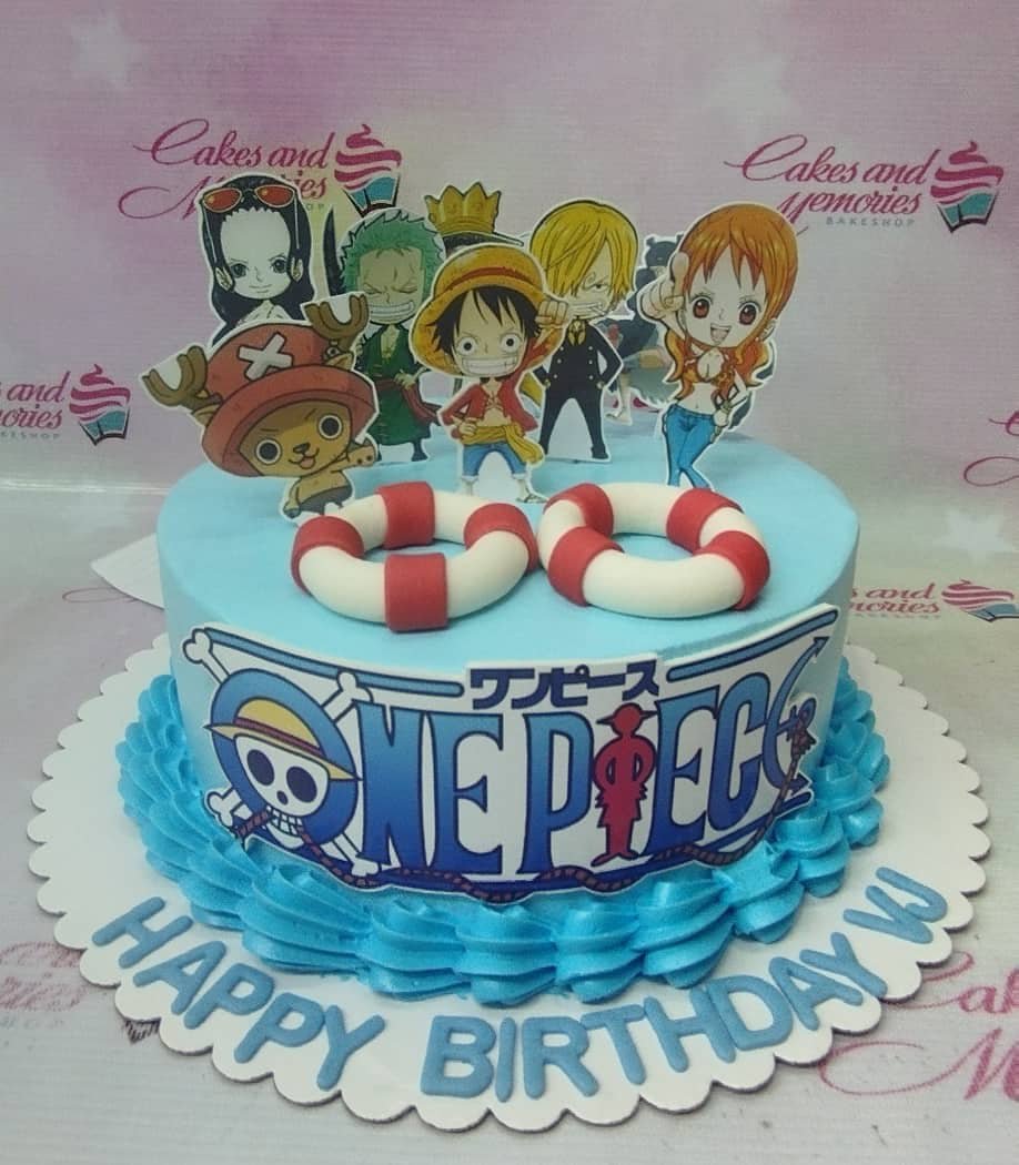 One Piece themed birthday cake with light blue icing, character printouts, and lifebuoy fondant decorations.