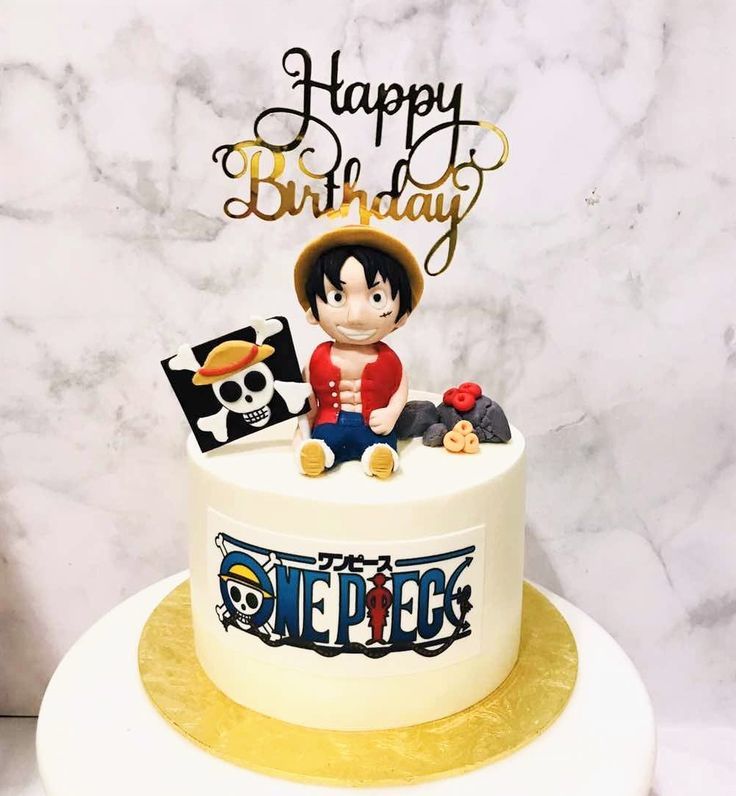 One Piece themed birthday cake with a 3D Luffy figure, pirate flag, and logo on white icing.