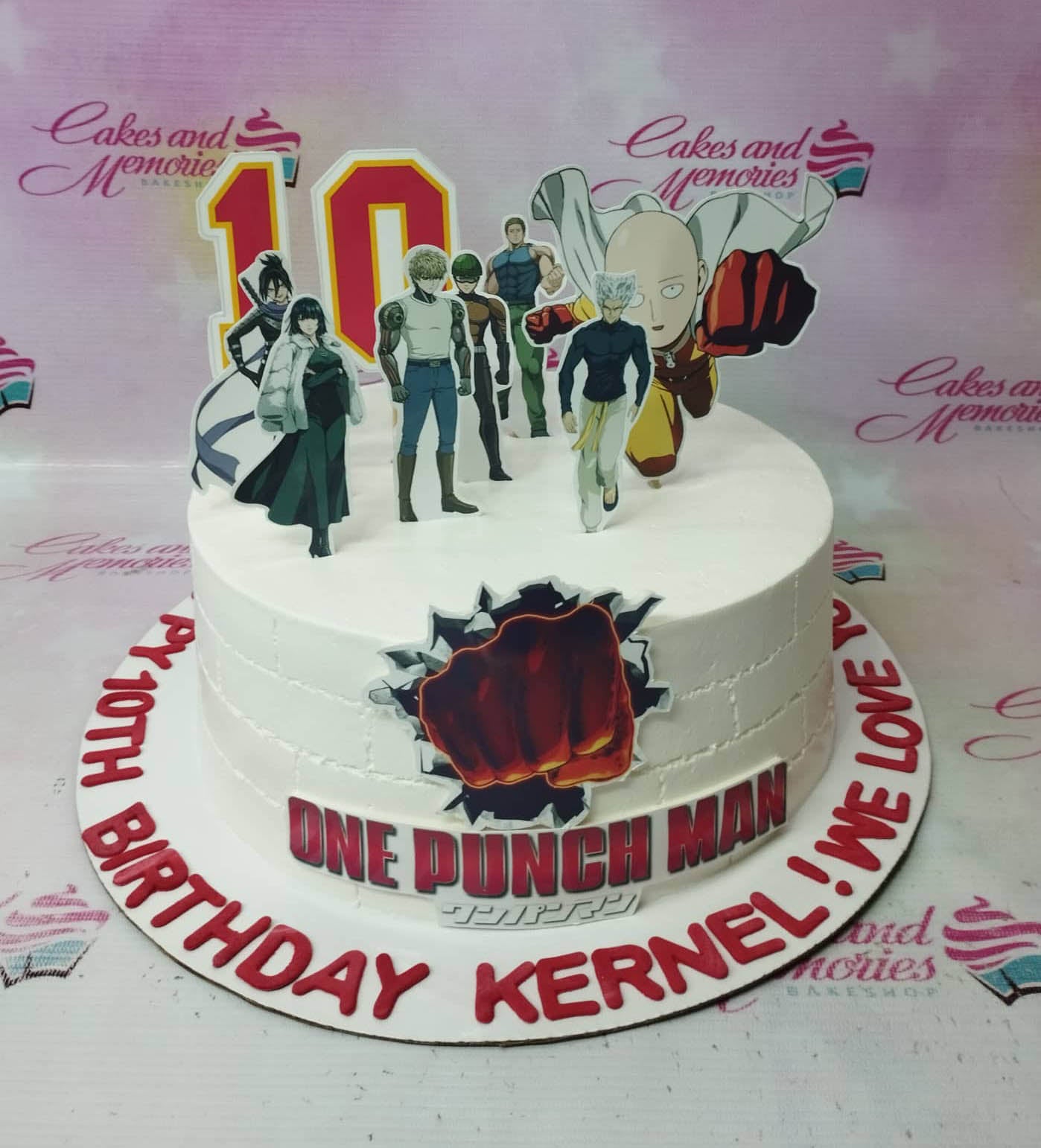 One Punch Man themed birthday cake with character printouts and a red fist logo on white icing with a brick pattern.