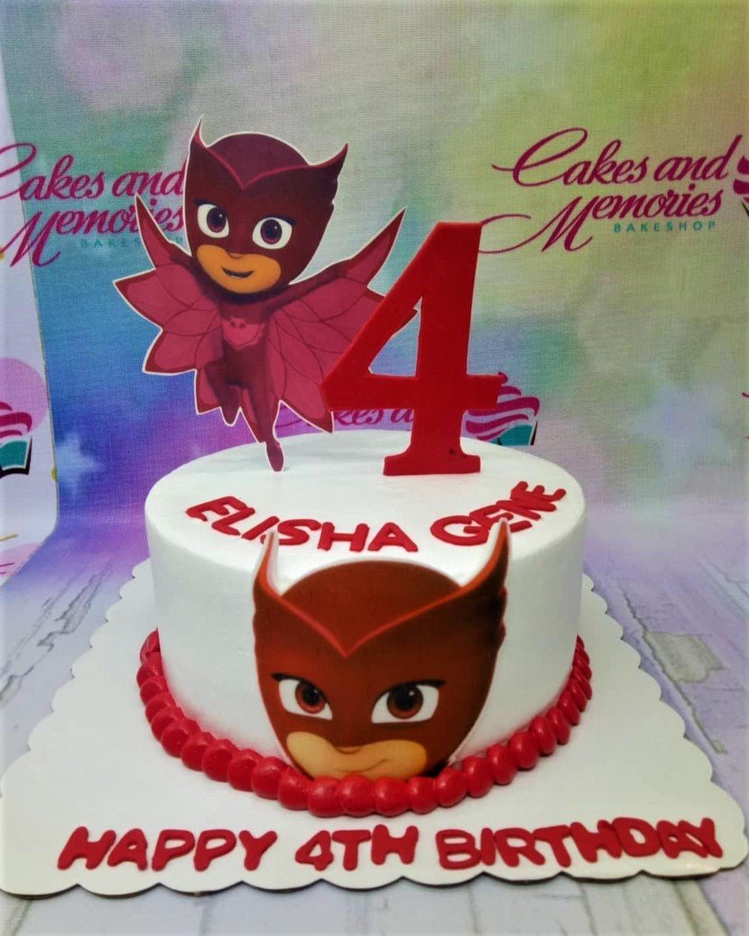 White 1-tier PJ Masks Owlette birthday cake with red icing borders and character printouts.