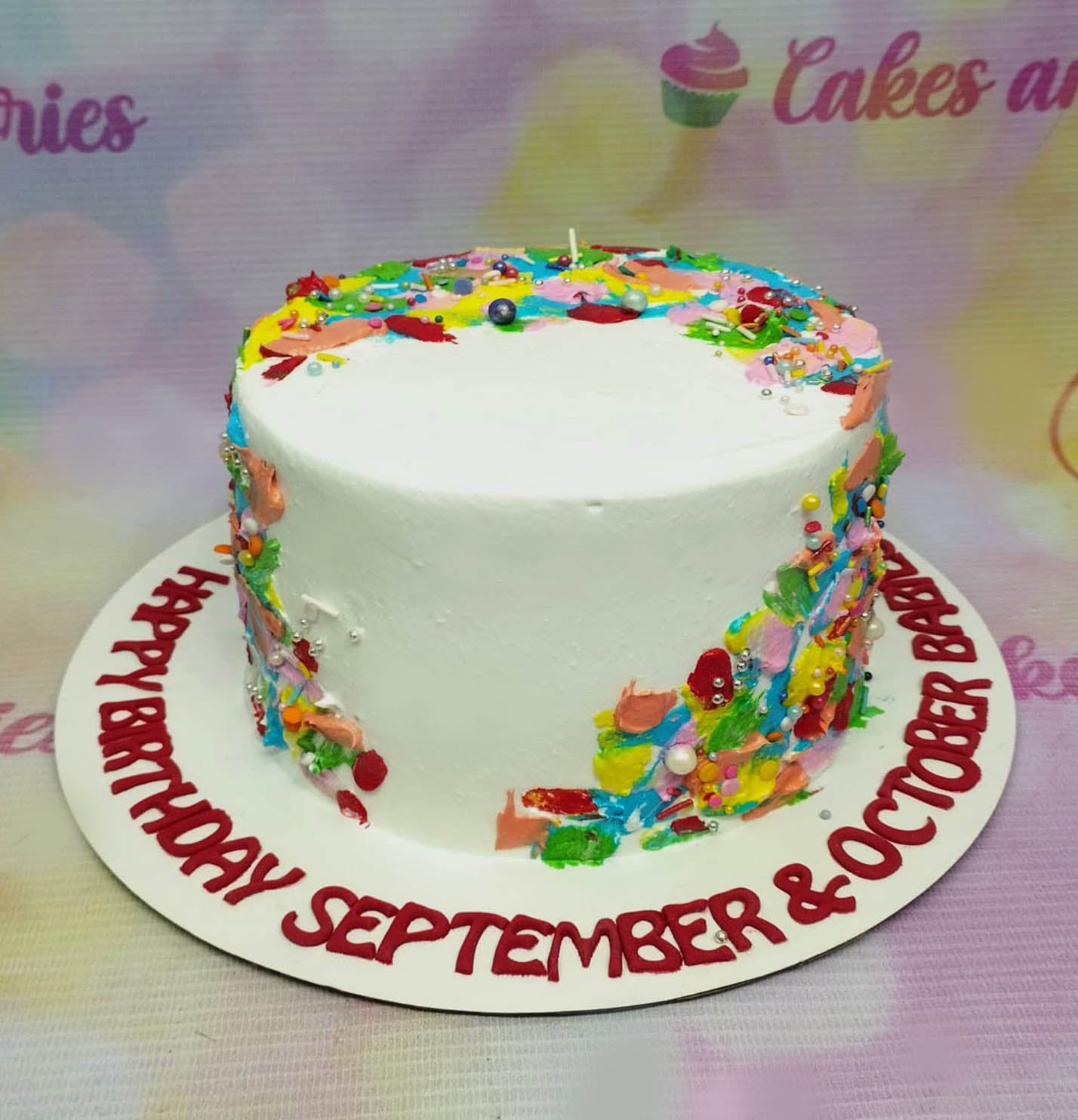 White minimalist cake with colorful palette knife icing strokes and metallic sprinkles on a white base board with red birthday message.
