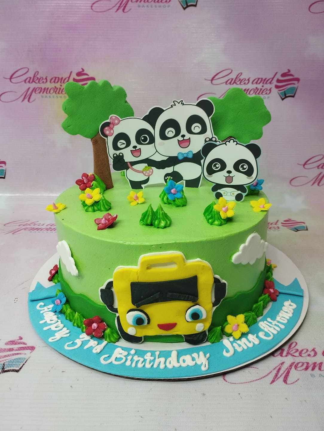 Green panda and bus themed birthday cake with 3D panda toppers and a yellow bus decoration on the side.