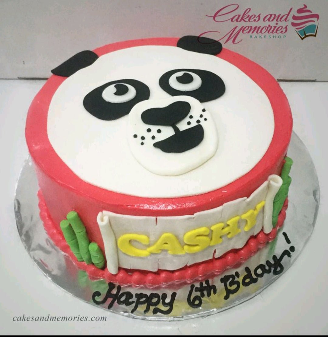 Red and white panda face cake with green bamboo accents and a yellow name banner.