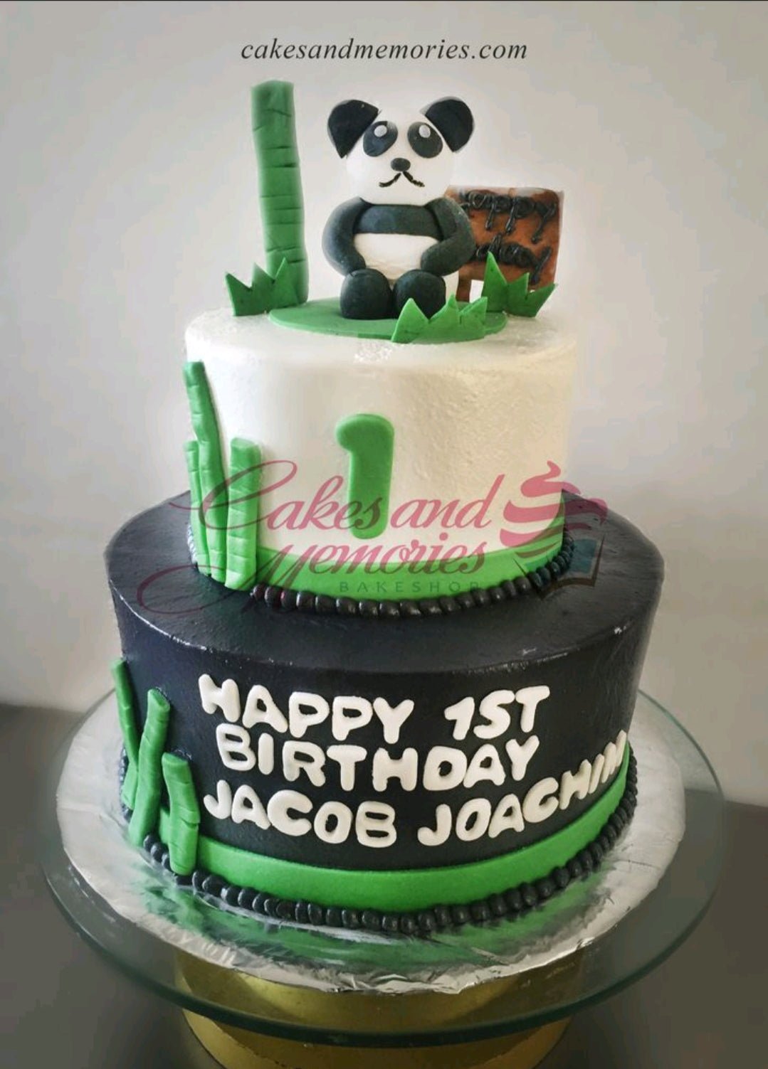 Two-tier panda themed birthday cake with black and white icing, green bamboo accents, and a fondant panda topper.