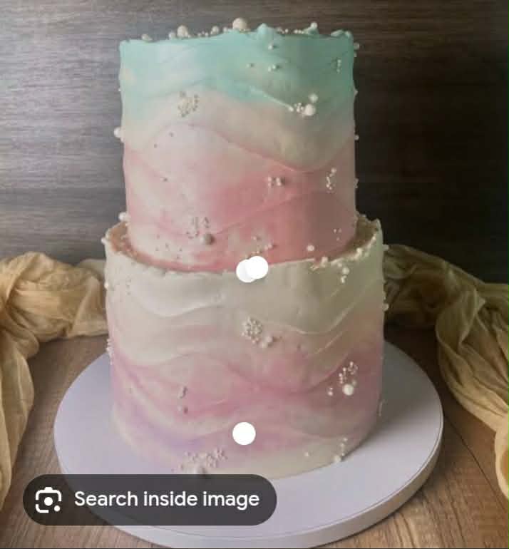 Two-tier pastel ombre cake with textured light blue, pink, and ivory icing decorated with white edible pearls and silver dragees.