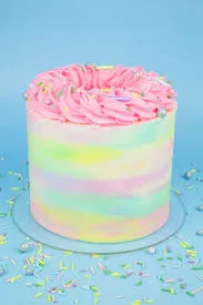 A tall single-tier cake with pastel rainbow watercolor icing, topped with a thick pink icing swirl and colorful sprinkles.