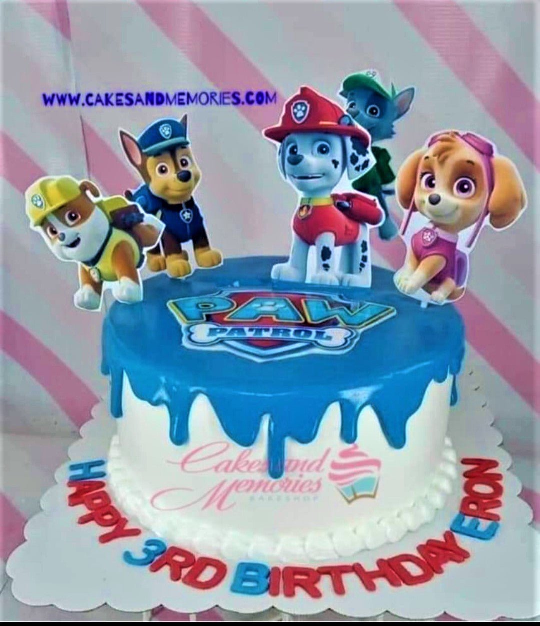 Paw Patrol themed birthday cake with blue drip icing and character printouts on a white base.