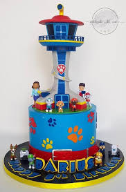 Blue Paw Patrol themed cake with a large lookout tower topper, character figurines, and paw print decorations.